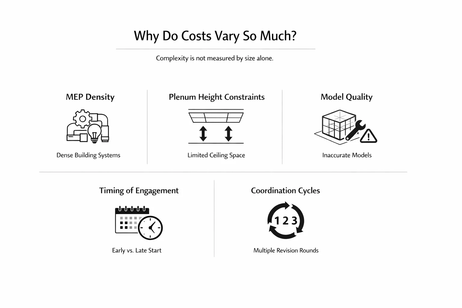 Project dynamics also matter. Some projects resolve conflicts in two or three structured rounds, while others require multiple cycles due to design changes or stakeholder decisions. Each additional coordination round increases overall cost.