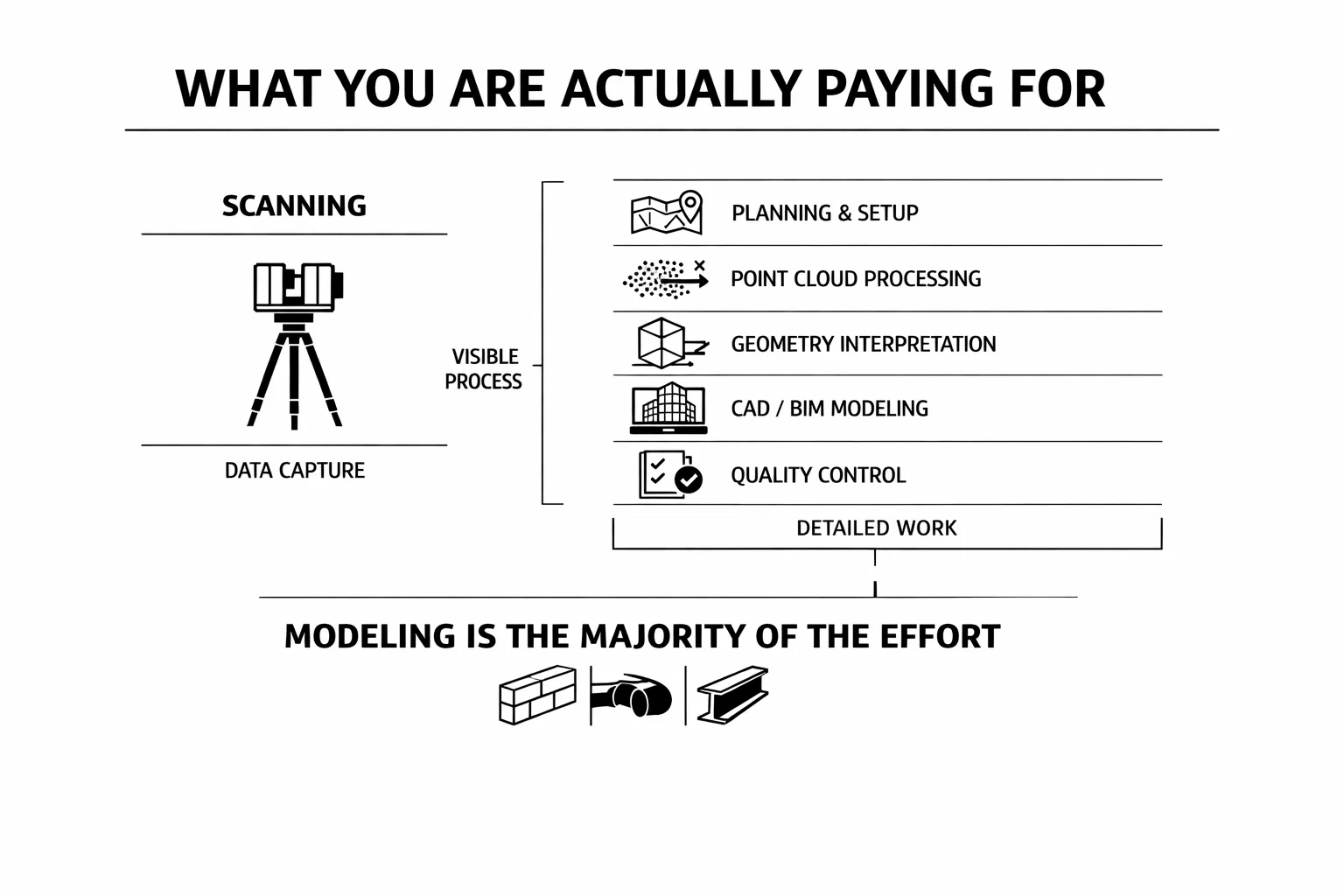 Existing conditions modelling is usually the cost driver. Converting point cloud data into usable drawings or coordinated models requires significant manual work and technical judgment.