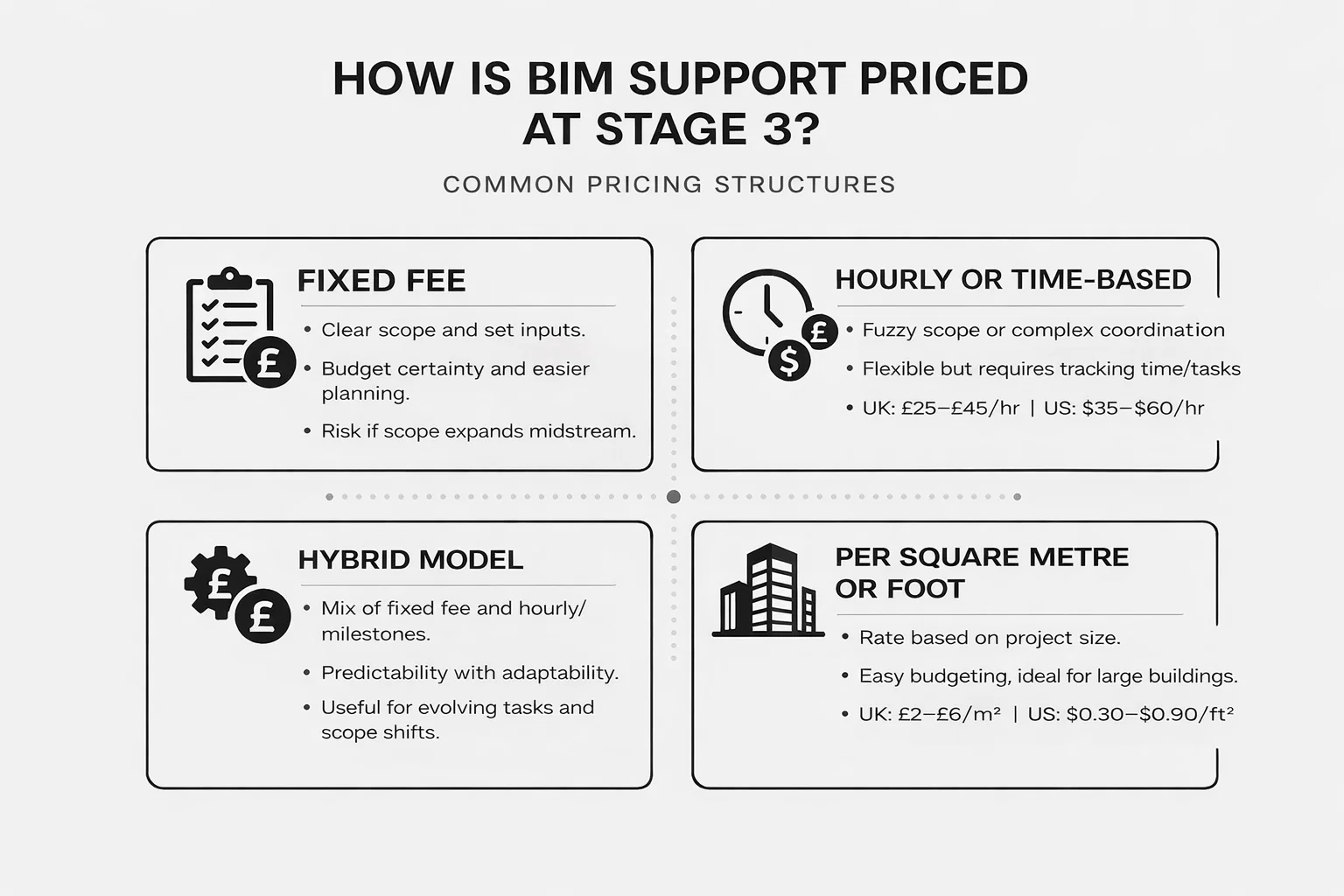 When the scope is fuzzy or coordination is expected to be messy, hourly billing tends to be the safer option. It’s especially useful for troubleshooting, last-minute support, or helping resolve a backlog of clashes. Rates in 2026 generally fall between £25 and £45 per hour in the UK, or $35 to $60 in the US, depending on the experience level and complexity of the work. It gives you flexibility but makes tracking time and tasks even more important.