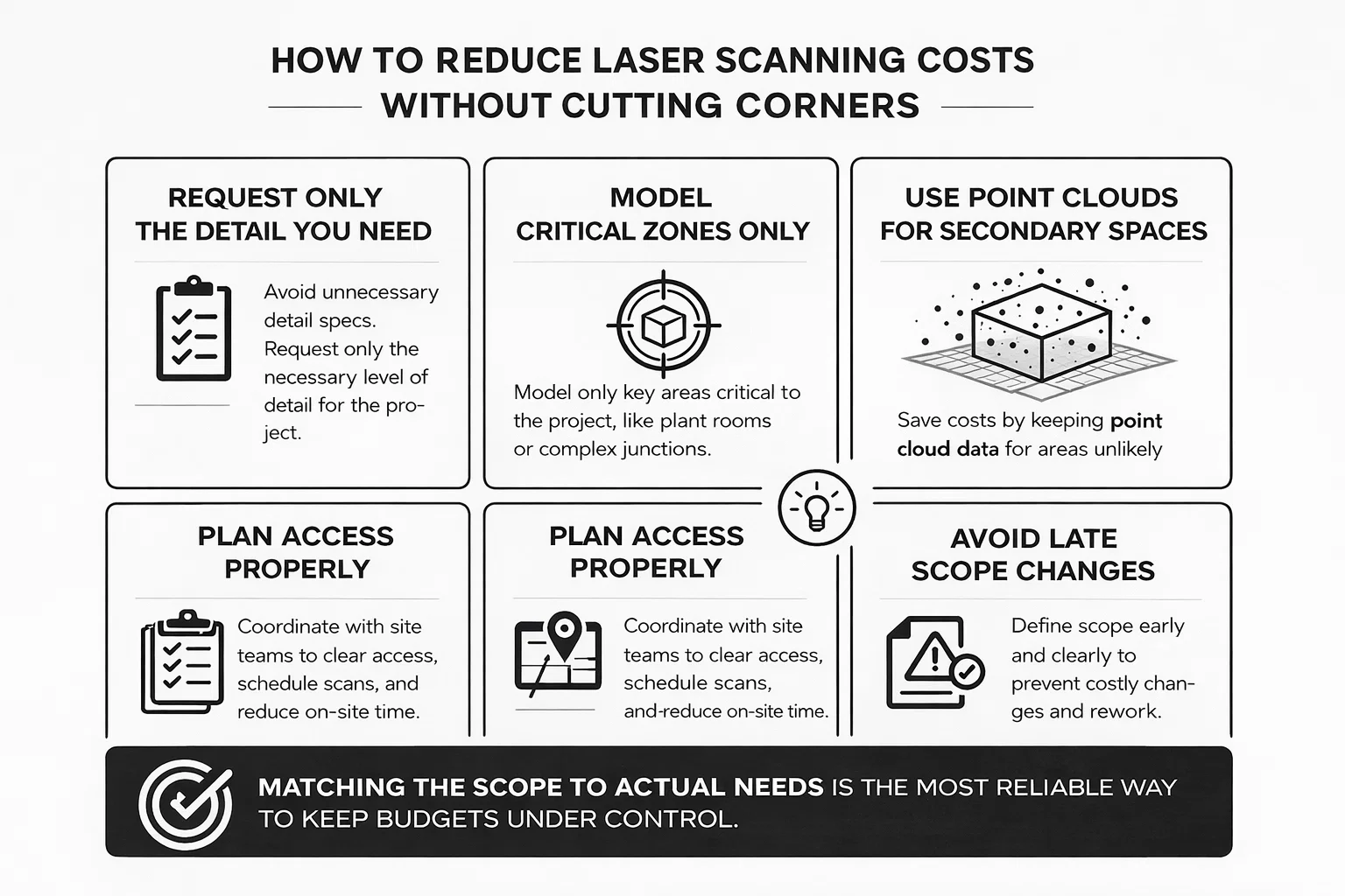 • Avoid Late Scope Changes. Changes after scanning or modelling has begun often lead to rework. Defining deliverables, formats, and levels of detail clearly at the outset helps avoid revisions that add cost without improving outcomes.