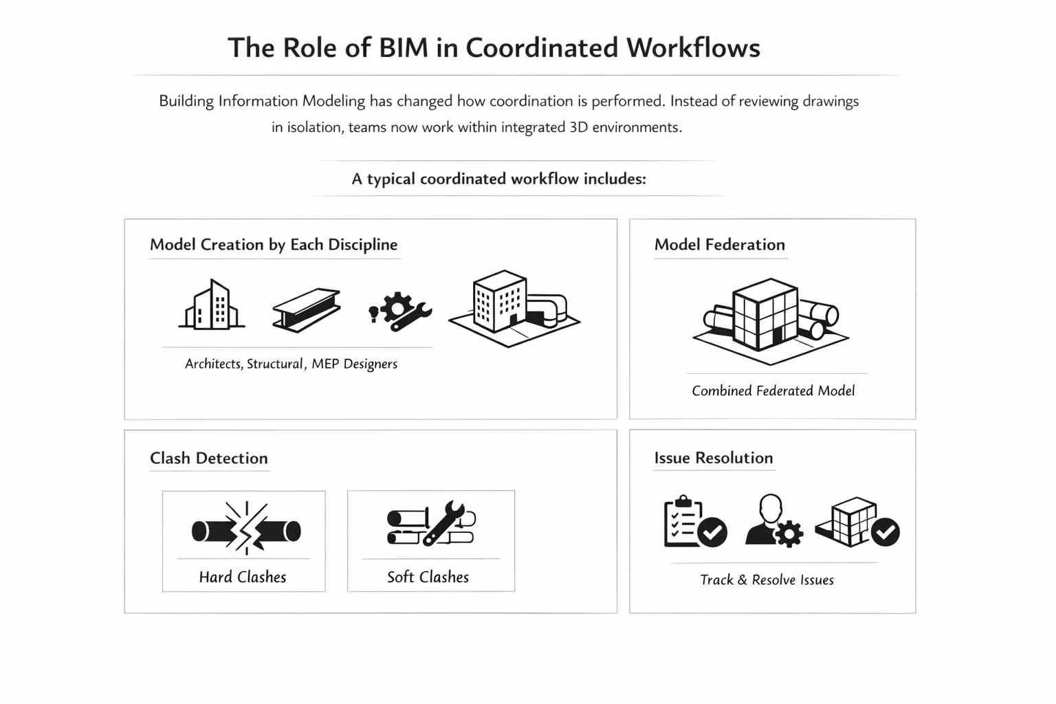 Building Information Modeling has changed how coordination is performed. Instead of reviewing drawings in isolation, teams now work within integrated 3D environments.