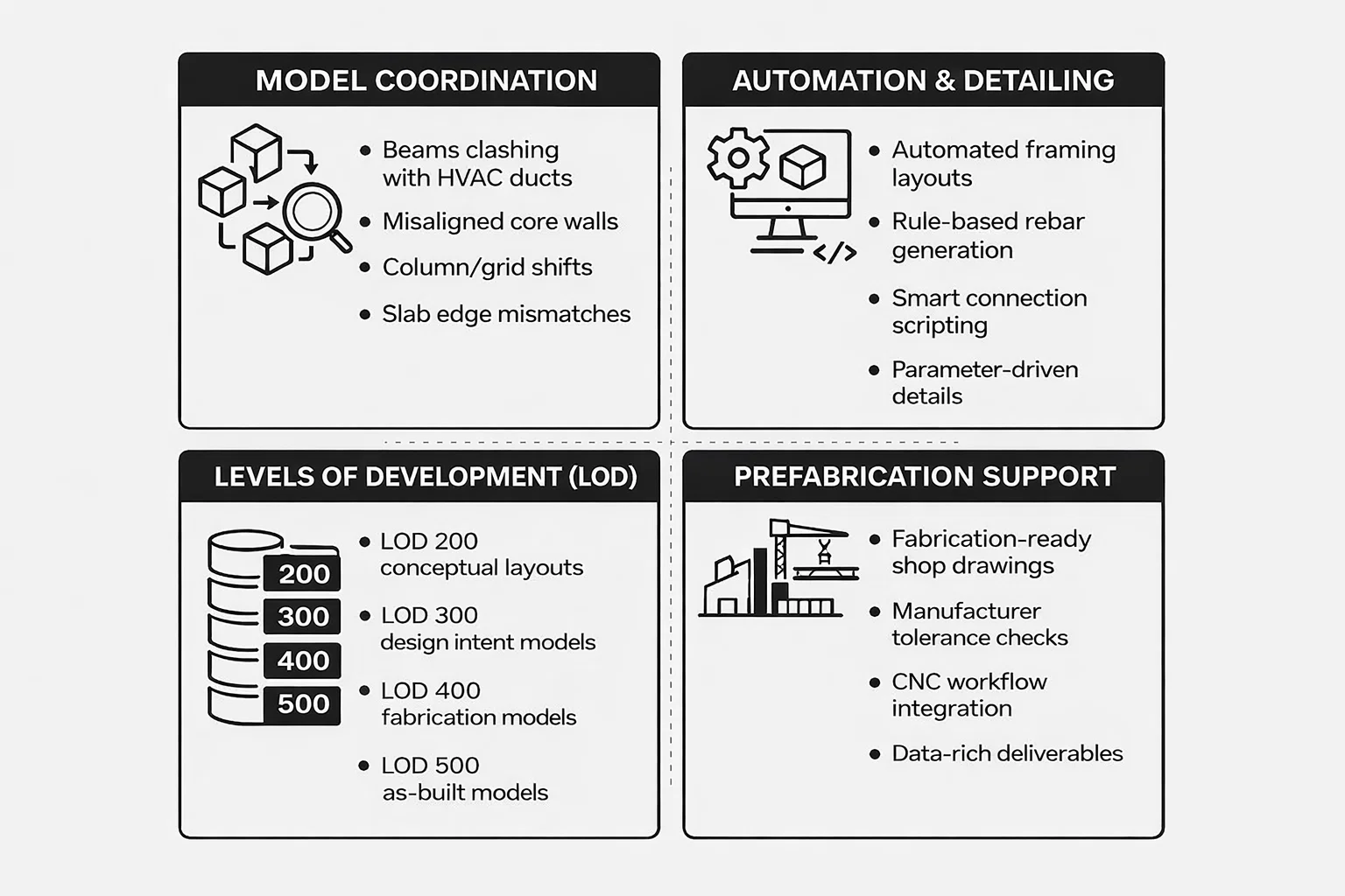 If the project involves precast, steel fabrication, or modular assembly, the BIM model needs to be far more precise than typical design models.