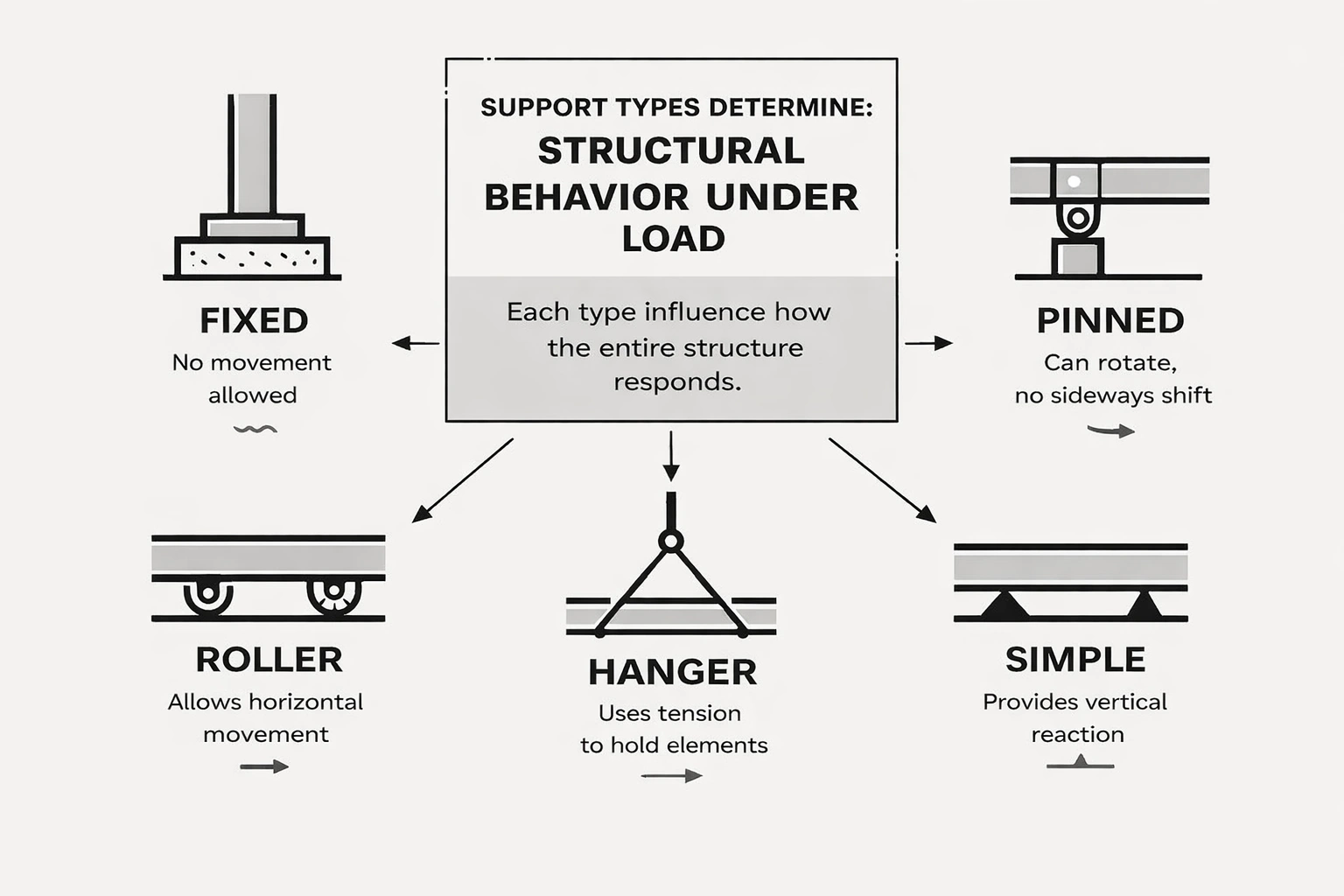 Not every support is the same. In fact, how a structure is supported determines how it behaves under load. There are a few key types of supports used in structural design: