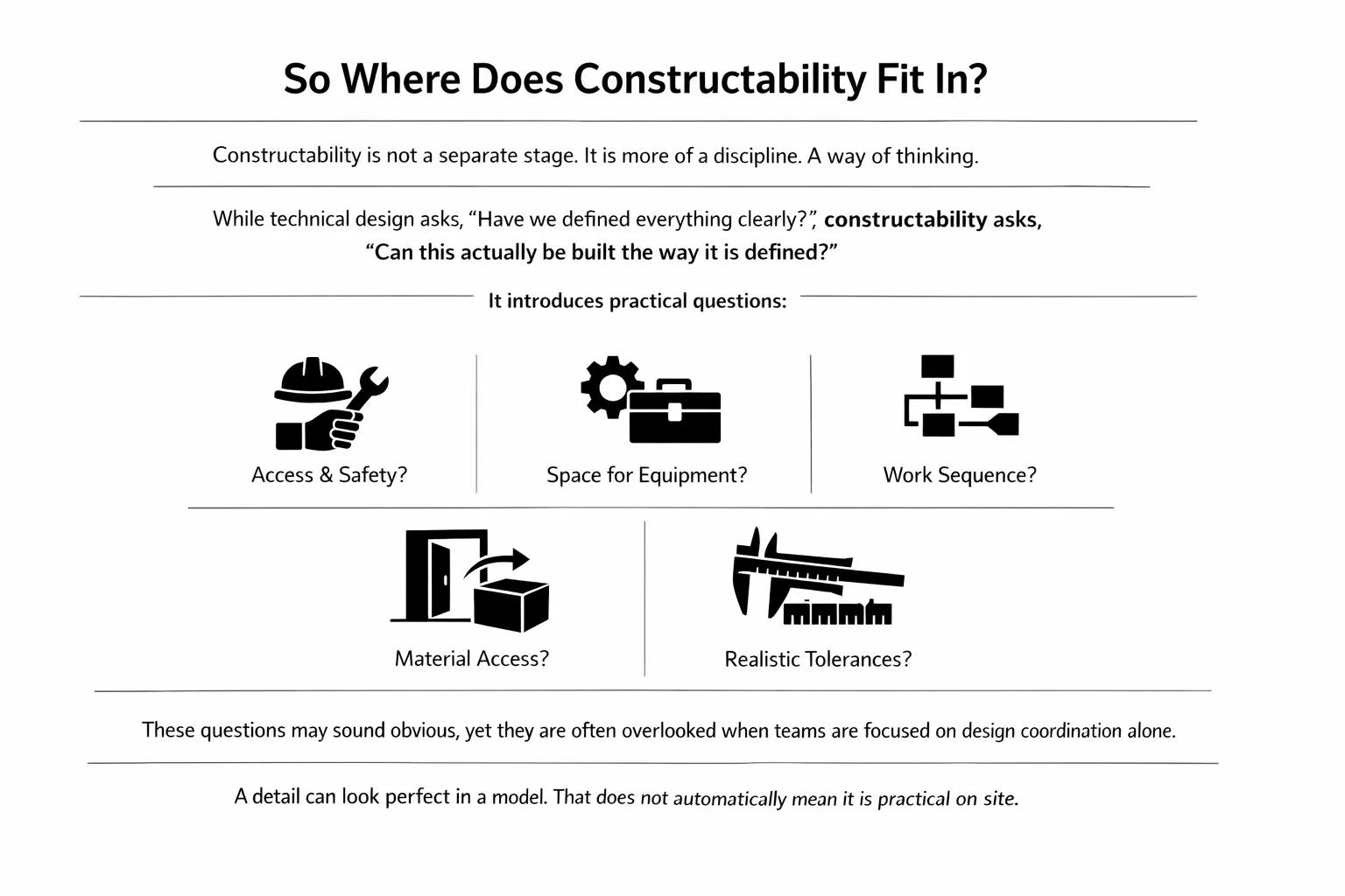 While technical design asks, “Have we defined everything clearly?”, constructability asks, “Can this actually be built the way it is defined?”