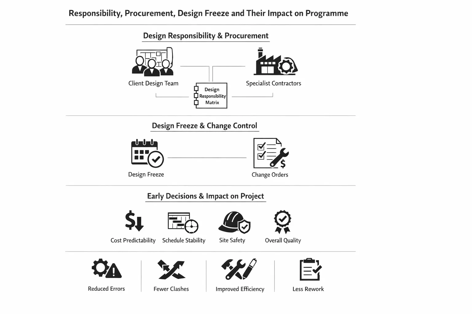 Technical design does not sit in isolation. The way responsibility is structured, how procurement is arranged, and when the design is frozen all influence what happens later on site. These decisions may seem administrative, but they shape coordination, risk, and ultimately cost and schedule performance.